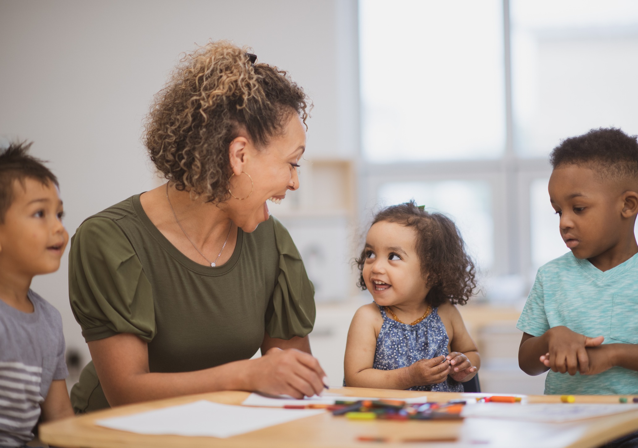 A person and three children sit on the floor in a classroom, engaged in an educational activity with materials.